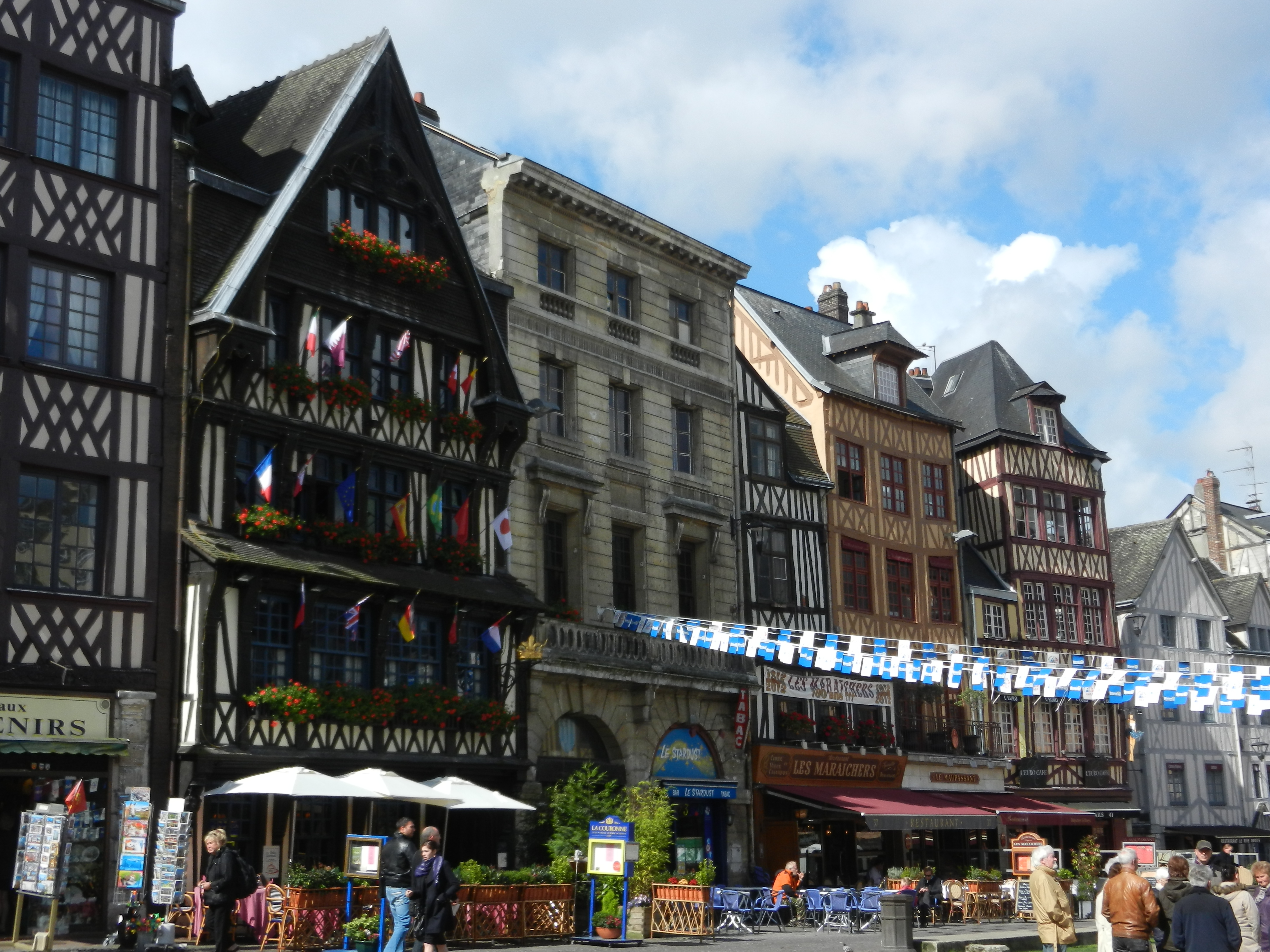 Before exploring WWII and the Normandy invasion, we took a morning stroll through Rouen, France. My first thought was that this is exactly the little French village depicted in the Disney film, “Beauty and the Beast.” With every turn on the cobblestone streets, the half-timbered homes and quaint French signage I expected Gaston and Belle to be singing and dancing from the rooftops. The shining star of the city is the cathedral. Construction of the church has had numerous additions during the past 1000 years, but it’s safe to say that by 1035 there was a permanent structure here. The cathedral contains the tomb of Richard the Lionheart which contained his heart. Also, the tomb of Rollo, an ancestor of Richard and first ruler of the Viking principality that later became known as Normandy is located in the church. Like other sacred spaces in Europe, the city has grown around the church and getting a view of the Gothic structure in all its glory is a challenge. We did discover a quiet garden on the side of the church which made for a nice spot to enjoy the cool morning.