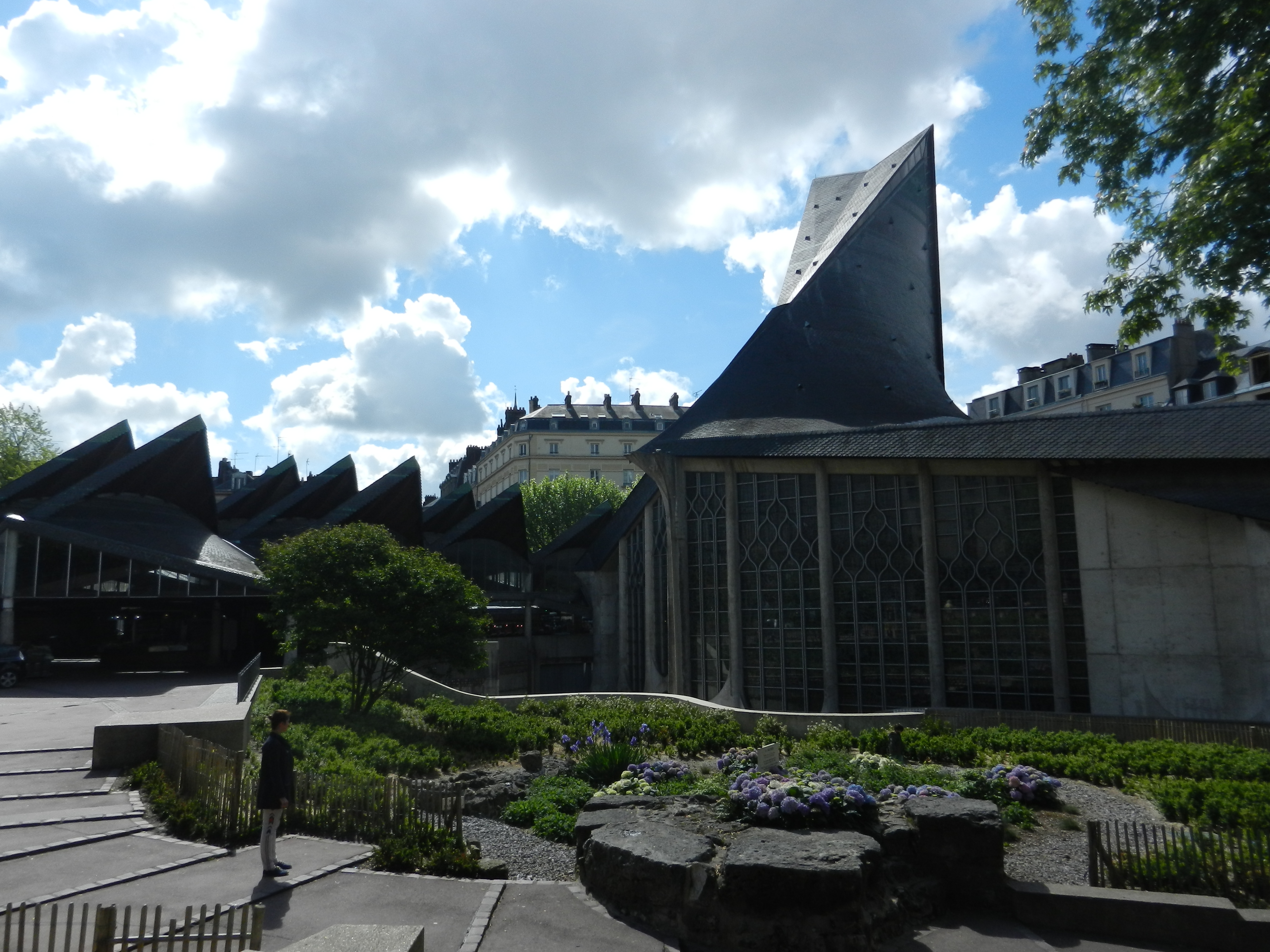 We continued our morning stroll through the town by following Rick Steves’ walking tour of Rouen. One of the more unusual stops was the plague cemetery which is now an open courtyard in an artists’ school. We also stopped by the large village clock which puts the Prague astronomical clock to shame and enjoyed the unique architecture of a church dedicated to St Joan of Arc who was burned at the stake in an area just in front of the church.