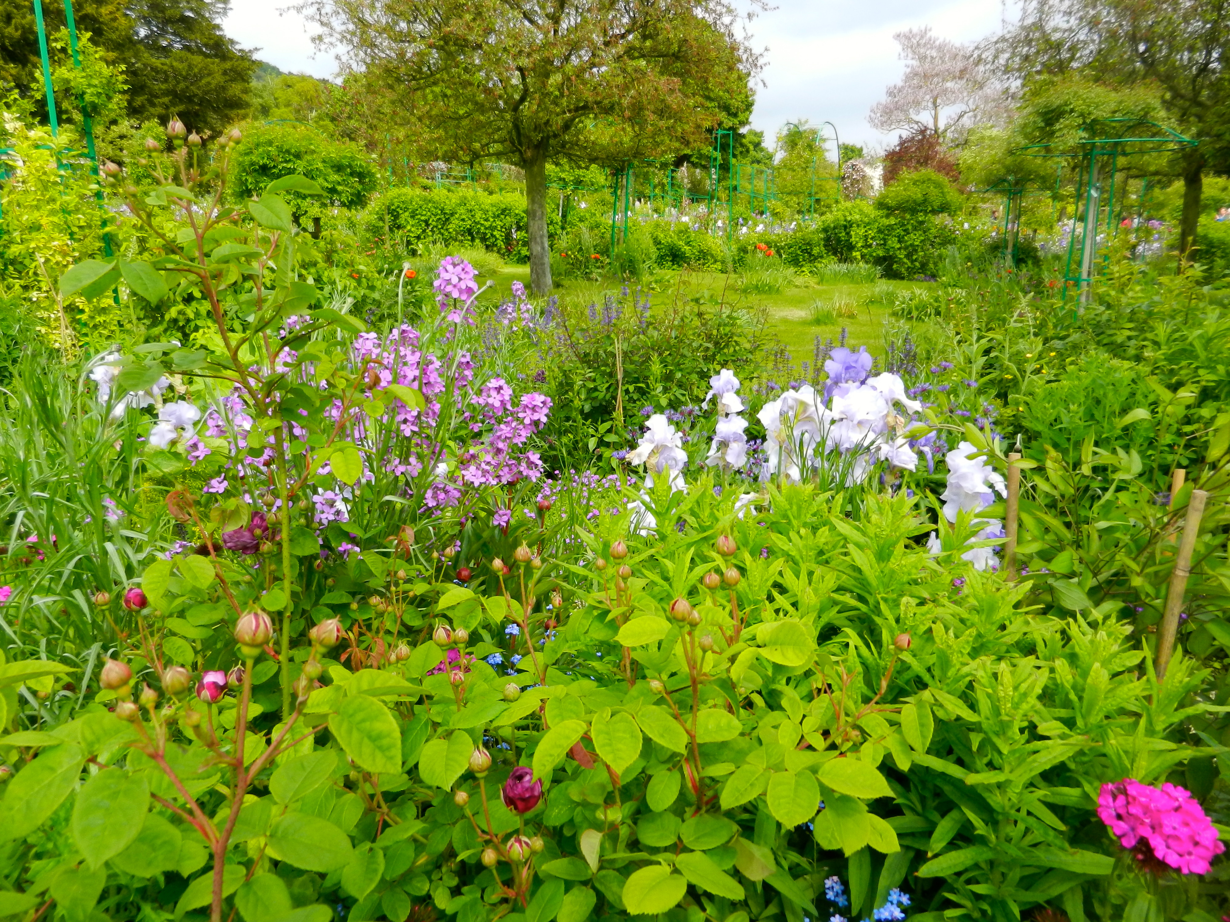 Located just an hour’s drive from central Paris, the town of Giverny has been overcome with tourists all with one thing on their mind…impressionist painters. Monet’s house still sits among his rambling gardens but the streets that line the entryway are chock full of bus pull-outs, gelato vendors and high-priced herb shops. We arrived just after 4pm in the hope of missing the bus tours and for the most part we were rewarded with clear pathways and great views of Monet’s Japanese bridge. I was astounded at the money-making enterprise it’s all become. Monet, himself a professional gardener, began work on the gardens soon after he and his family purchased the home in 1883. His design included a large flower garden that would continuously feature blooms from spring through fall. We were not disappointed. Although we missed the tulips by a few weeks we were treated to fabulous irises in vivid colors like deep purple and bright white. A strolling path leads visitors from the home and travels underneath the main road to the other side of the property where a river was diverted to make the large water lily pond. And this is where the magic takes place. There is something indescribably wonderful about walking slowly around the pond, seeing the bridge come into view, smelling the wisteria hanging heavy from the trees and seeing the perfect water lilies up close. The bridge, painted a bright green, is smaller than I expected and is clearly a very different bridge than the one in Huntington Gardens. But, it is no less spectacular a setting. The combination of flowering trees and shrubs can be fully appreciated while sitting on one of the many benches surrounding the pond. I believe Monet designed a most perfect garden than continues to thrive more than 100 years later. It feels like stepping right into one of his famous paintings.