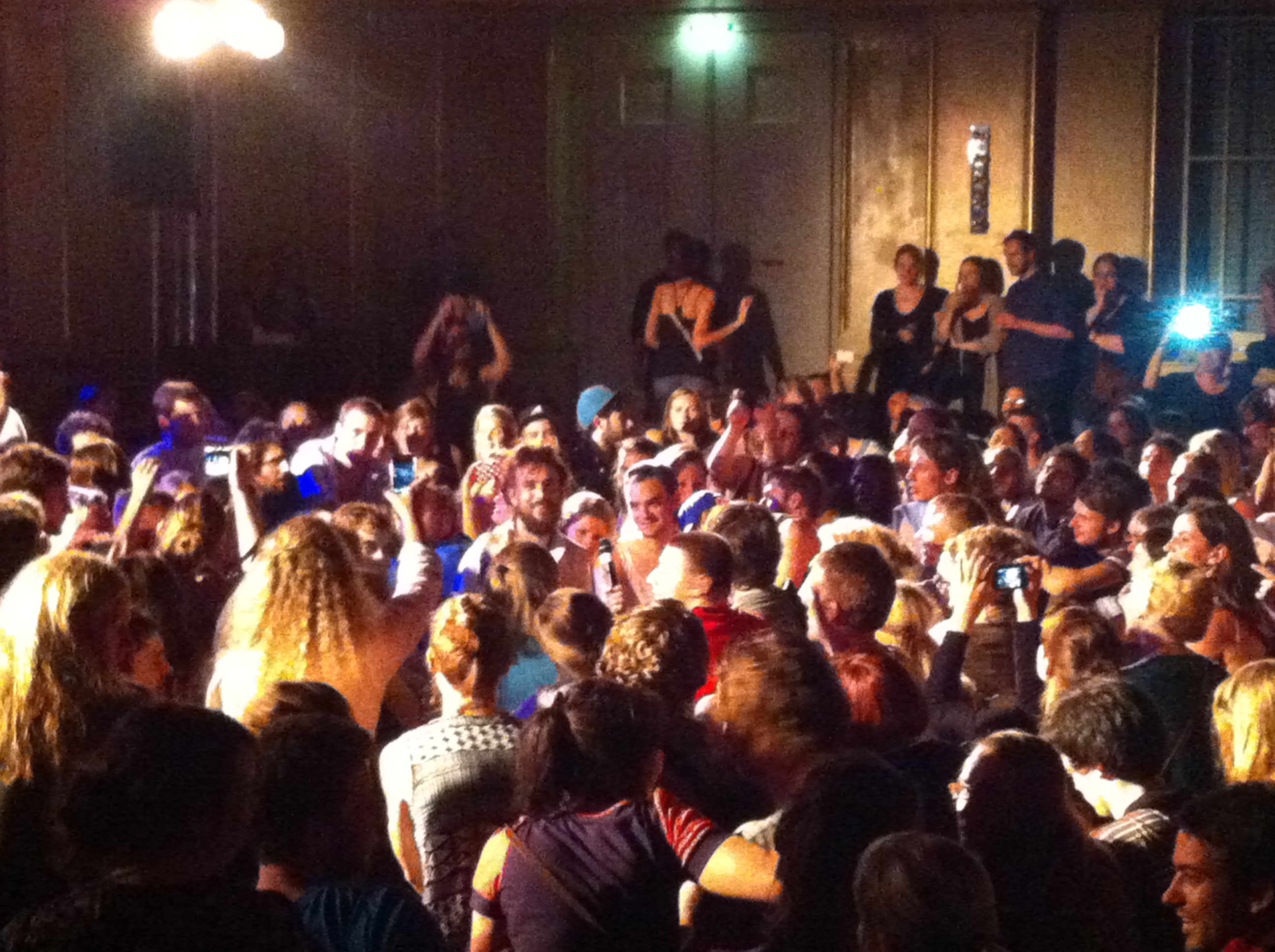 The band has a folksy sound and general vibe from all the members…coveralls worn by one of the guys, accordion and roller-skating organ music played by another. The general feel is one of happiness and light. At one point during the show, Alex walked into the standing-room only crowd and asked everyone to sit down. He then proceeded to sing from within the middle of the circle as everyone swayed along to the music. The band members even abandoned their posts and joined the crowd by sitting on the edge of the stage.