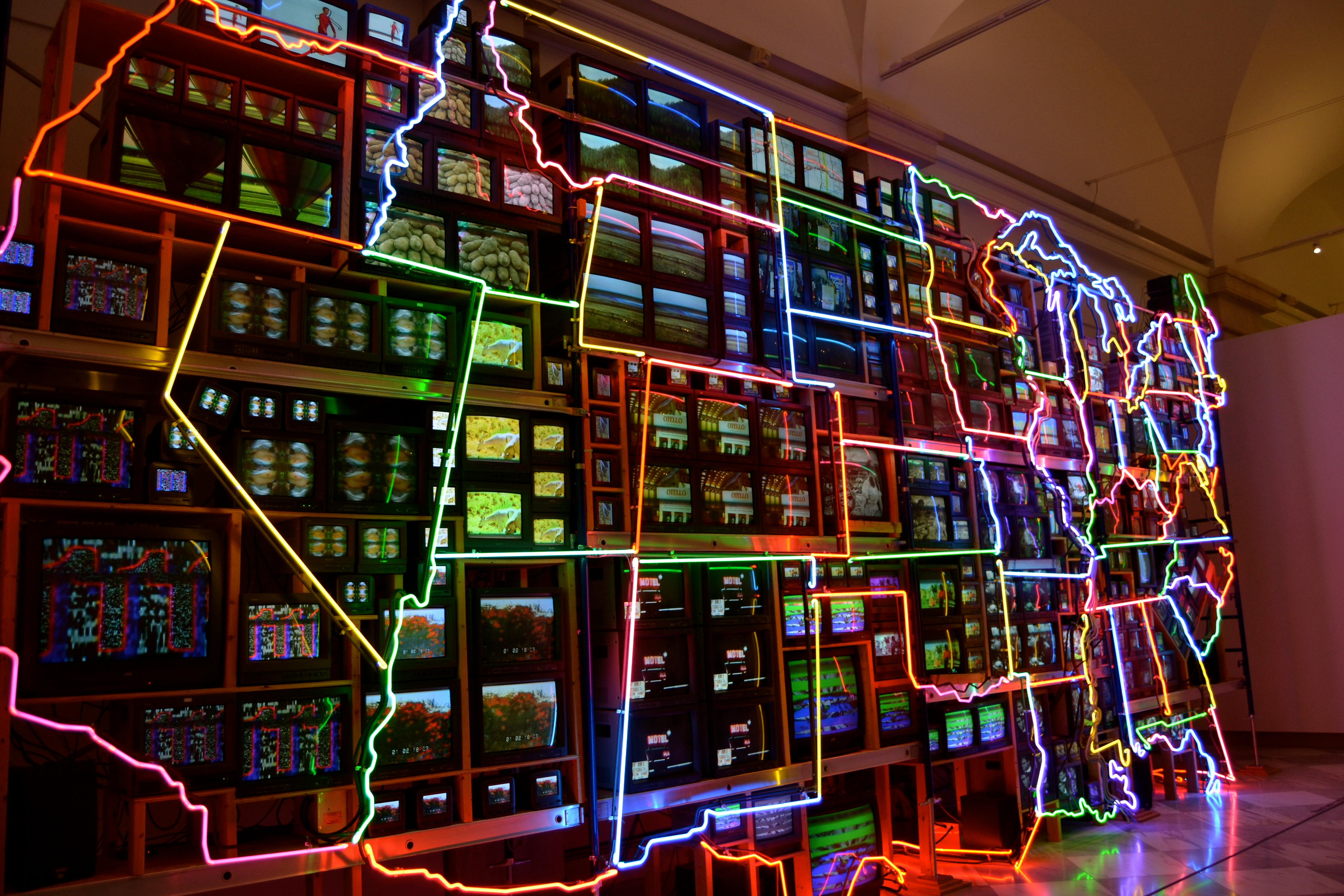 Past visits to DC have been focused on the museums and monuments on the Mall. Lindsey let me know there is a gem of a museum near Chinatown on 8th and F streets. The National Portrait Gallery and American Art Museum focuses on individuals who have made significant contributions to the country. Most visitors begin their tour with the President’s gallery which includes each of the presidents in all his glory. Some interesting images of Kennedy, Nixon and Clinton were on hand as well as our favorites like Washington, Lincoln and Jefferson. Popping over to the other side of the museum we spied a great neon map of the United States. A wonderful use of light and color with mini-TV screens showing looped images of each state, like the Wizard of Oz for Kansas, earthquakes and Richard Simmons for California and big-bad tobacco for North Carolina. And the best part? a little TV Camera captured our image and displayed our faces on the TV screen placed in Washington DC. Nice touch.