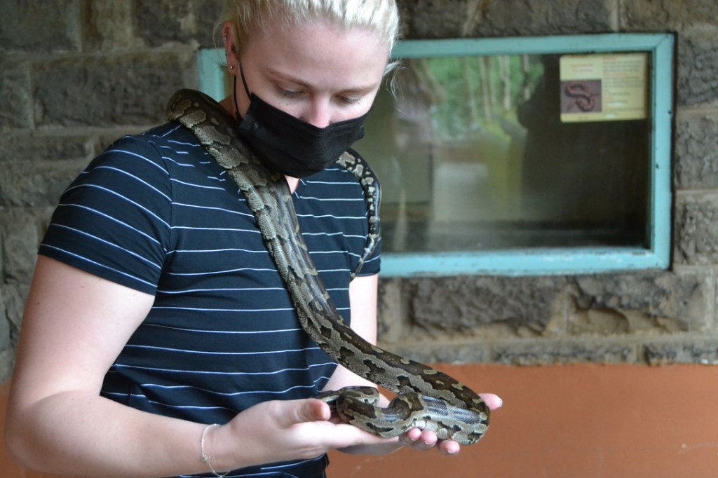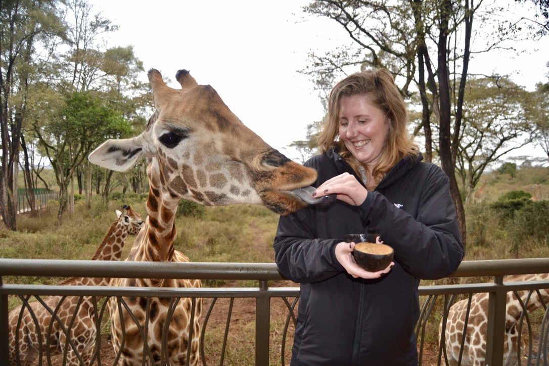 - Feeding giraffes at Giraffe Center. We’ve fed giraffes at San Diego Safari Park but this place takes it to another level. You get a bowl of pellet food and then it’s a free for all as the giraffes deftly use their tongues to get as much food as possible. They are not shy! It was a treat to feed both adult and baby giraffes and to watch warthogs scatter about their legs. In the distance, we spotted Giraffe Manor, a hotel where you can eat with the giraffes from your breakfast table.