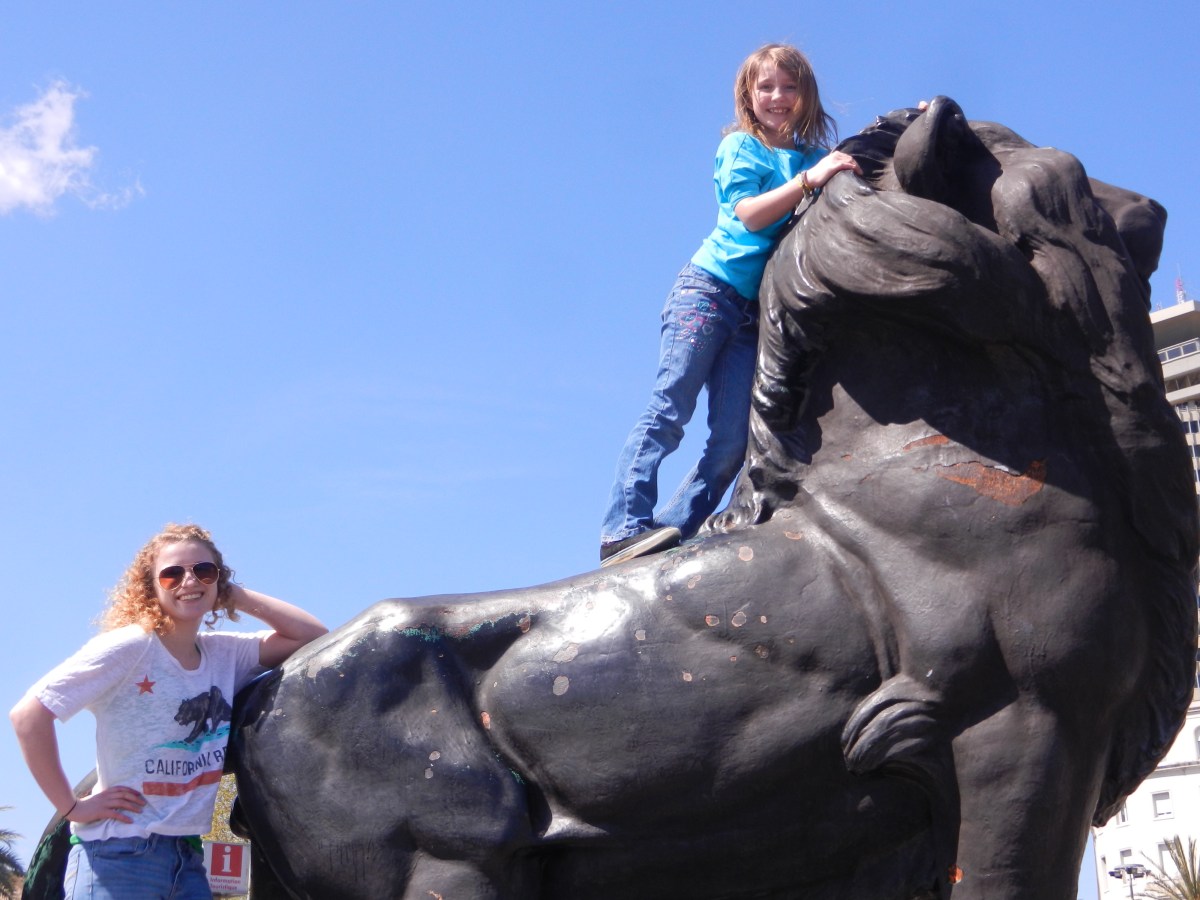 Climbing the lions at base of Columbus statue