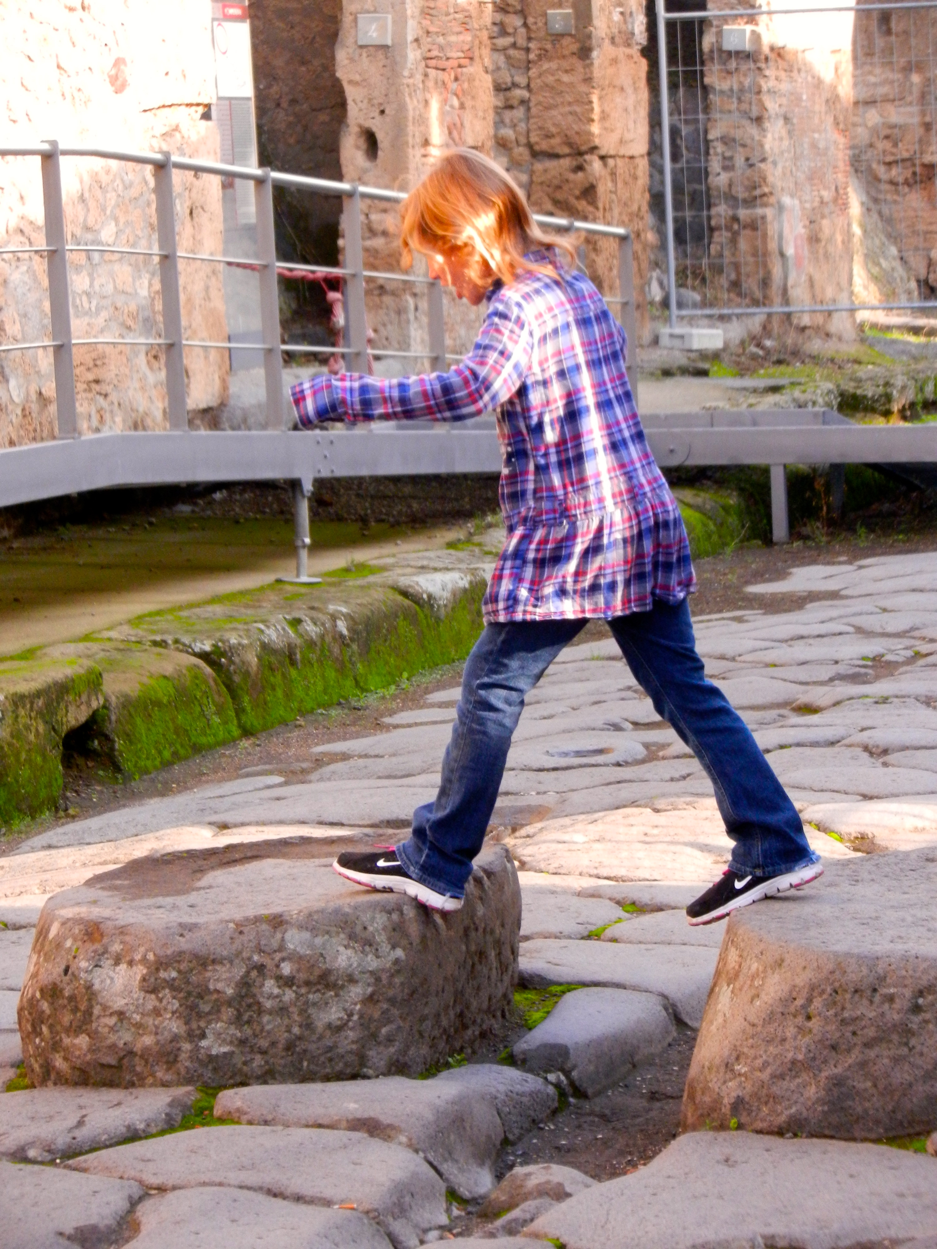 DSCN8561 Published April 6, 2013 at 3000 × 4000 Lilly crosses the street using stepping stones placed to avoid mud and muck