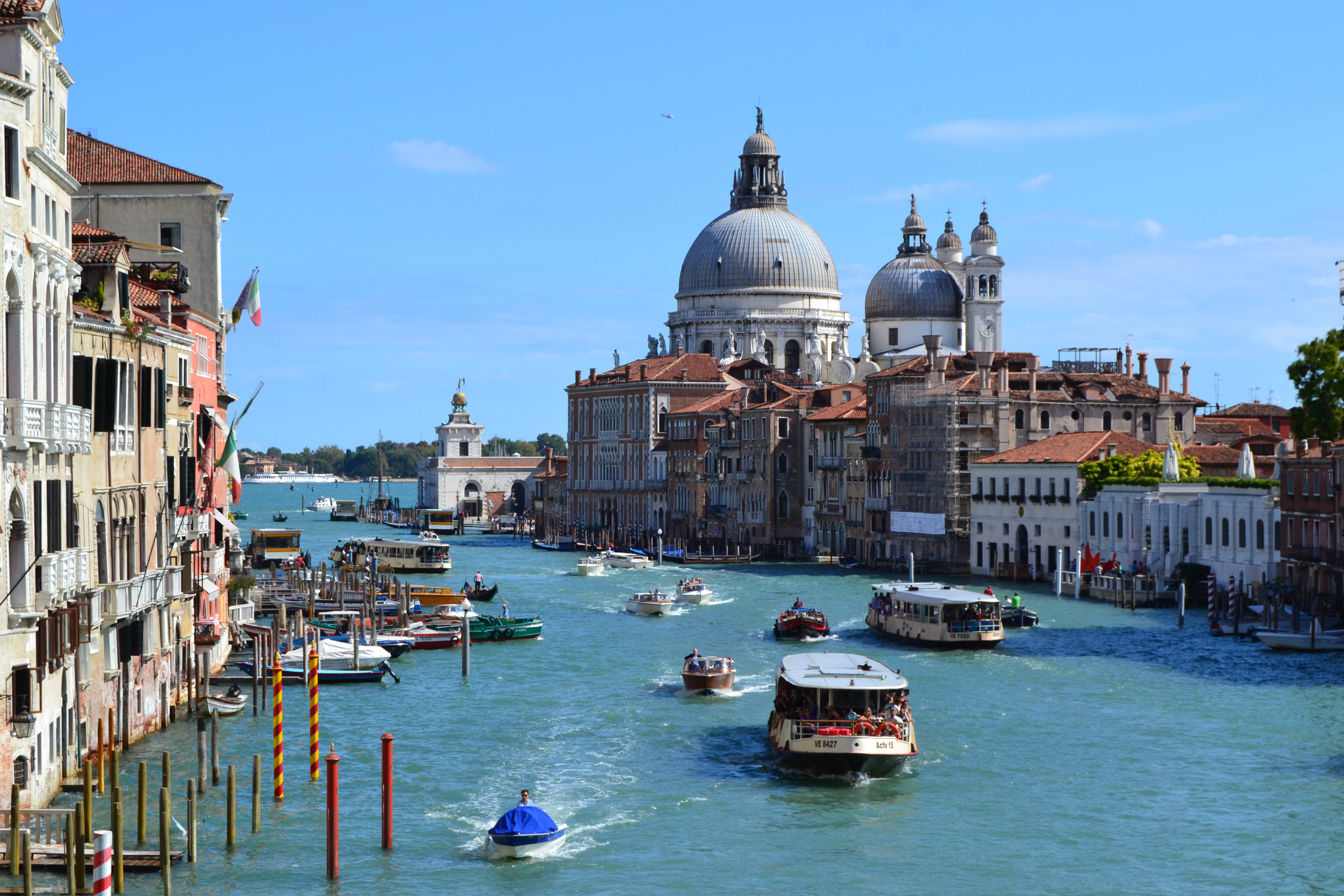 We woke to the most beautiful Italian fall sky and knew it was going to be a great day to visit Venice. We’ve toured Venice on several trips before but this time we were looking to do something a bit different, off the beaten “tourist” path. It’s a bit of a slog to drive from Aviano to Venice, primarily because the most direct route takes you through little towns and hundreds of round-abouts. I’m a fan of the round-about but when you have 3 in a row all within 1/2 mile, it just gets to be annoying. We made it to the parking garage around noon; we selected the Tronchetto lot after trying to get into San Marco and discovering that it had a long waiting line to get in. Not a problem because the walk from Tronchetto includes a chance to admire the cruise ships docked for the day. This afternoon there were four massive ships including one from Princess Lines complete with a jumbotron screen on the top deck showing a movie. I guess some passengers just don’t care for Venice all that much. Once we got closer to the city we decided to veer right–to the art museum–instead of going left, which would put us on a beeline for St Mark’s Square. This was a wise choice because our walk to the Guggenheim Gallery was practically people-free. Every square we came to had about 10 tourists standing in the middle, looking at maps, wondering where to go. It was great fun exploring this side of the city where the alleyways were dark and mysterious and I had plenty of time to casually stroll and peek into the storefront windows. A lot of art was for sale as well as leather gloves in an assortment of rich colors and decorative fur trim. Missing from this walk: the tidal wave of tacky souvenirs and street performers that seem to concentrate near Rialto Bridge and Mt Mark’s Square.