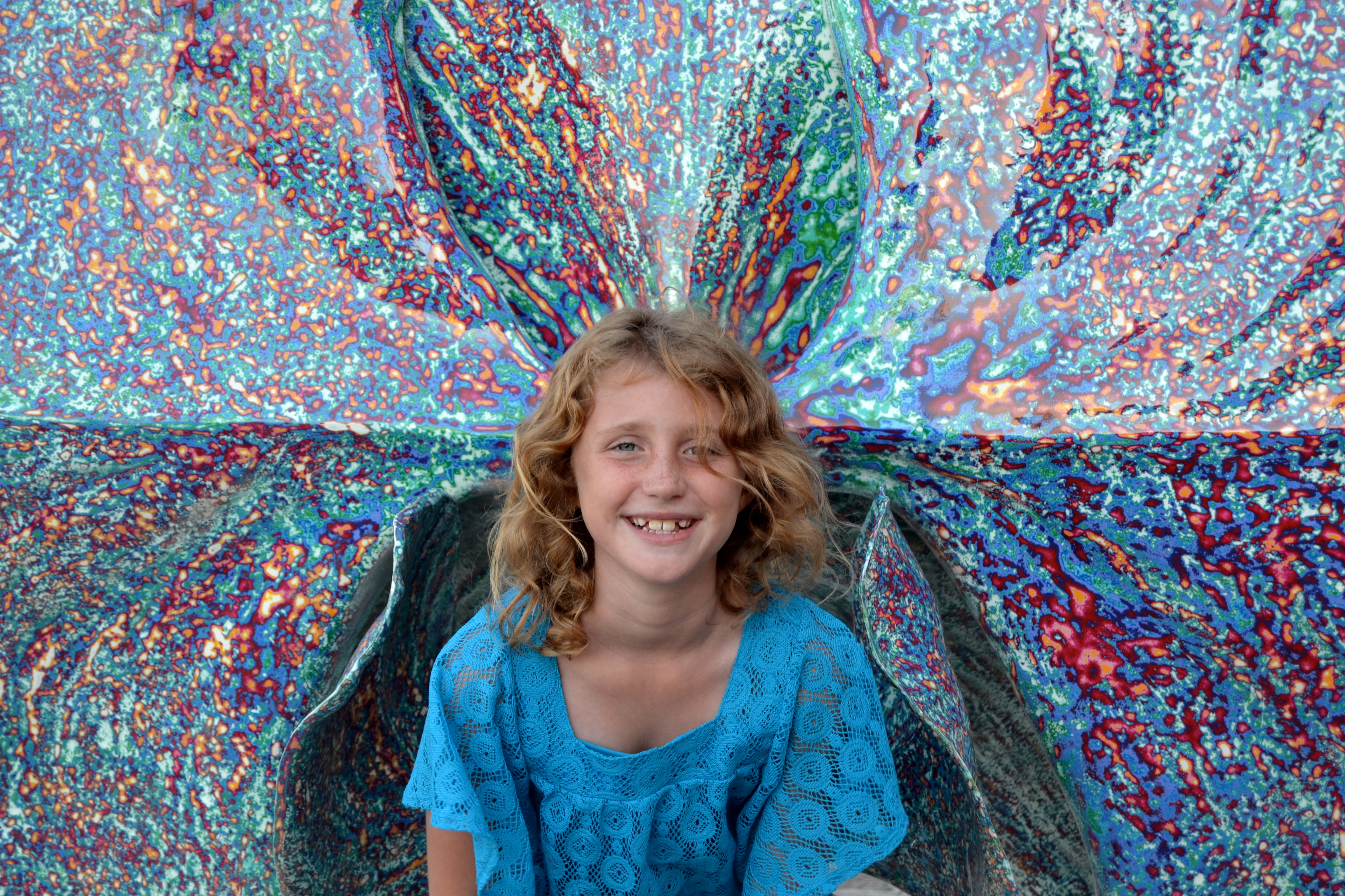 Lilly poses in front of an imposing shell sculpture on San Giorgio island