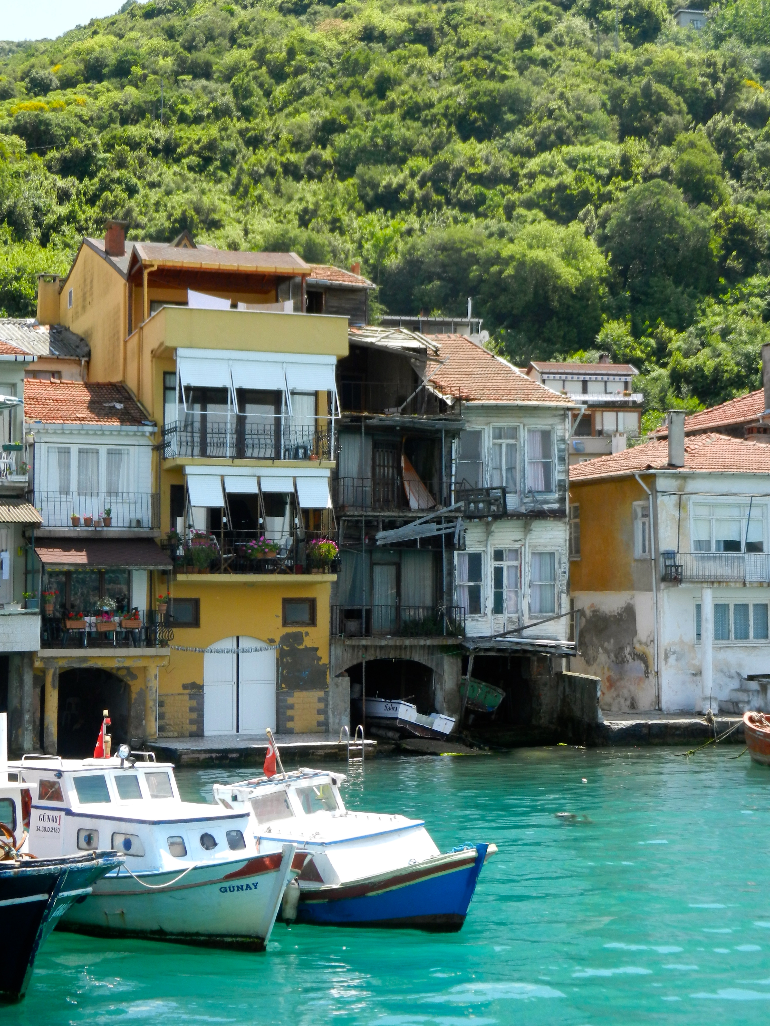 Sunday morning dawned bright and sunny and we knew it was a perfect day for a cruise on the Bosphorus. We ate at the hotel buffet and made it across the bridge by 9:15am. We were trying to get to the IDO boat docks by 9:30am. Even though the boat wasn’t scheduled to leave until 10:30, we had read that on nice days people start to queue up early for the best views and today was no different. About 50 people were already in line so we paid for our tickets (25 lire round trip) and managed to find great seats on the side of the boat looking out at the European side of the city as we departed. These seats proved to be an excellent choice. Palaces, embassies and a castle were on offer as we made the 90 minute trip down the Bosphorus to our docking point: Anadolu Kavagi, which is located on the Asian side of Istanbul. We enjoyed a nice walk up to castle ruins and then ate lunch seaside. On the menu…fresh fish, of course. We had prawns in butter and friend calamari and then concluded the meal with chicken shish kebabs. We were in the little fishing village for about 2 hours before the boat made the return trip back to Istanbul. It was an absolutely delightful way to see the city and catch a quick glimpse of life on the water in Turkey.